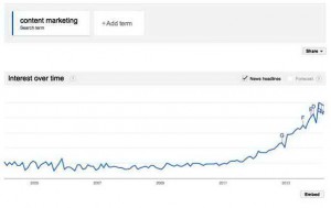 سواری بر روی این موج و روند جدید، بطور عجیبی وحشیانه بوده است و همانگونه که «آلوی» می گوید روشن است که این آتش قرار نیست به این زودی ها شعله اش پایین کشیده شود. کافی است به شکل زیر که جستجوی کلمه بازاریابی محتوایی در گوگل نشان می دهد نگاه کنید تا روند را دریابید. اما قبل از اینکه به طور کامل این صنعت را تحلیل و در مورد آینده آن بگویم دوست دارم همانگونه که به پایان ربع اول سال ۲۰۱۴ نزدیک می شویم، قدمی به عقب بردارم و وضعیت این صنعت را به از گذشته بررسی کنم و در مورد ریشه های آن صحبت کنم. در نهایت بدانیم که: چطور به اینجا رسیدیم و آینده چگونه خواهد بود.